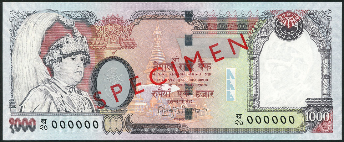 (x) Nepal Rastra Bank, specimen 20 rupees, ND (1992), orange, specimen number 312, and specimen 500 and 1000 rupees, ND 2000), all with King Birendra at left, animals on reverse, all with red SPECIMEN overprints