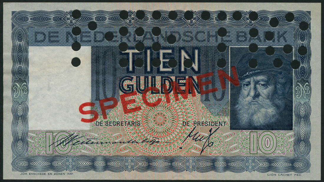 (x) De Nederlandsche Bank, specimen 10 gulden, 34 May 1968 (1933-1939), serial number AA 012345-AA 067890, blue and multicoloured, bearded man at right wearing cap, reverse lilac and multicoloured