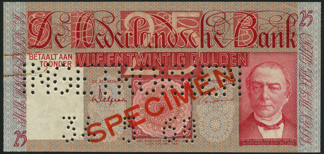 (x) De Nederlandsche Bank, specimen 25 gulden, 34 May 1968 (1931-1941), serial number AA 012345-AA 067890, red and multicoloured, W.C.Mees at right, reverse pink and multicoloured