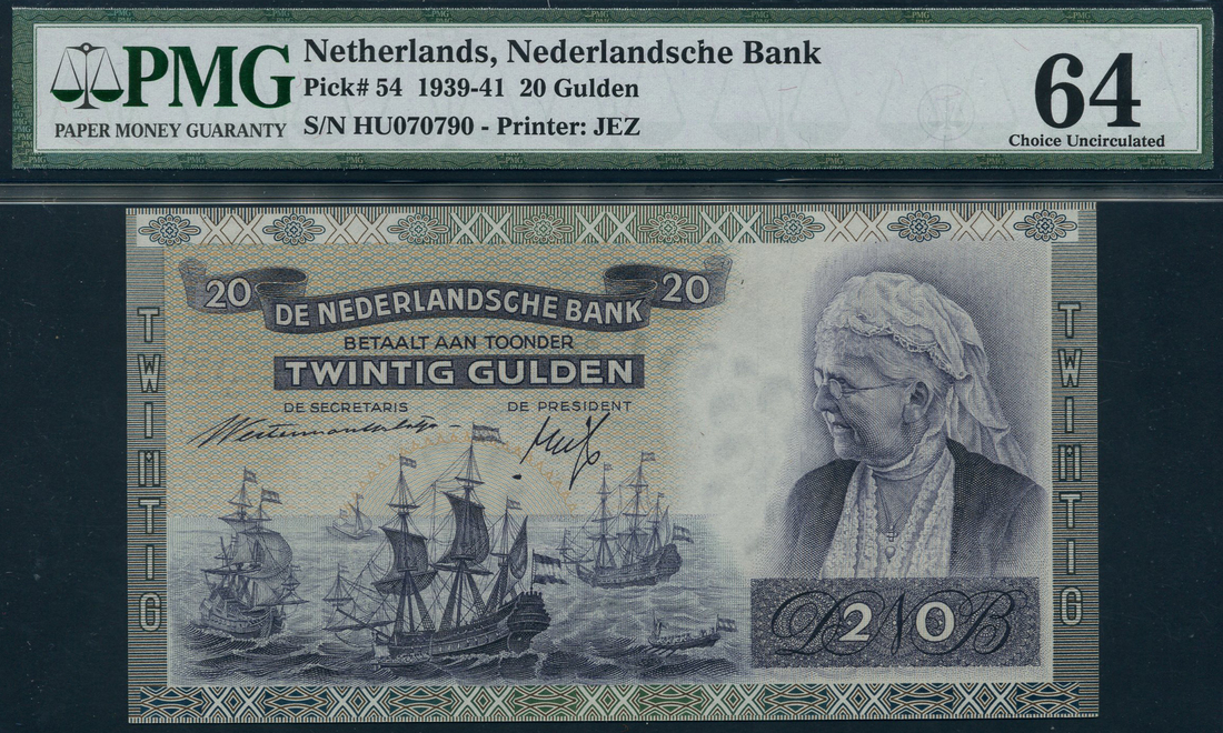 (x) Nederlandsche Bank, 20 gulden, 1941, serial number HU 070790, violet and olive green, portrait Queen Emma at right, sailing ship centre left, ornate border, reverse, Amsterdam scenes
