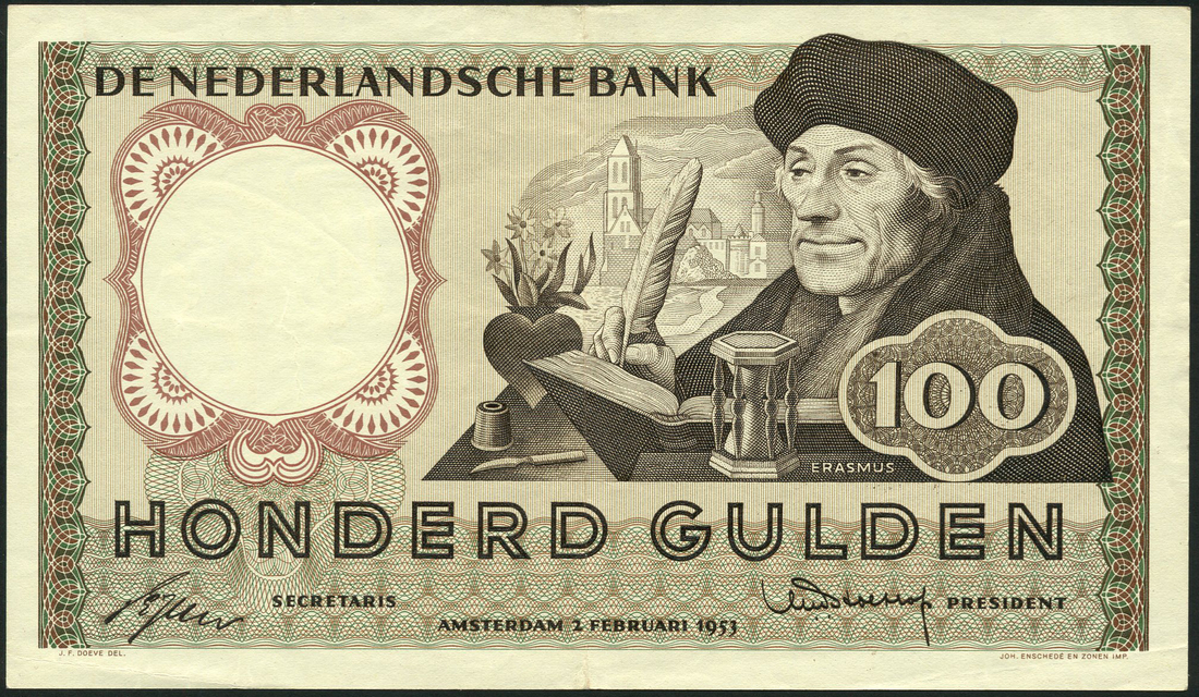 (x) De Nederlandsche Bank, 100 gulden, 2 February 1953, serial number 1 CD 089859, dark brown and green, Erasmus at right, reverse pink-brown