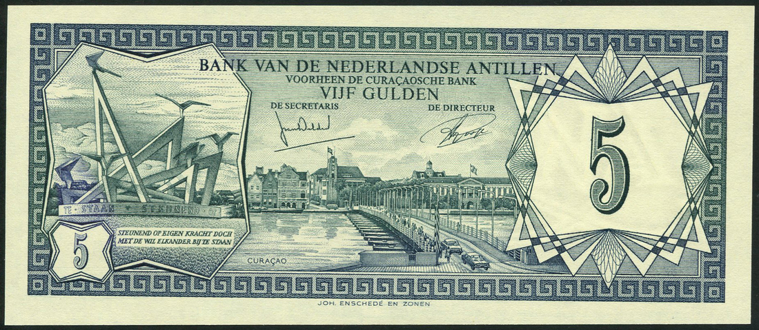 Netherlands Antilles, 5 gulden (3), 1 June 1972, serial number PB 225951/952/953, blue and green, the Statuut monument in Willemstad, Curacao, and view of Willemstad, Van Delden and Servage signatures top centre, reverse blue, arms at centre, value at left
