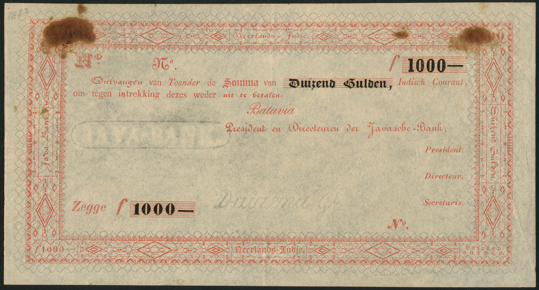 De Javasche Bank, 'Goed Voor' issue, Netherlands East Indies, unissued 1000 gulden, Batavia, ND (ca 1858-), no serial numbers red text on white background, ornate border around, denomination added in heavy black type