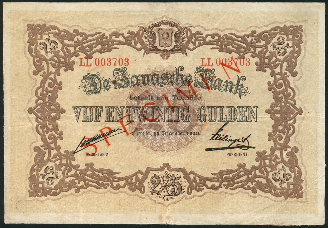 De Javasche Bank, Netherlands East Indies, specimen 25 gulden, Batavia, 15 December 1920, red serial number LL 003703, pale orange-yellow and brown, arms top centre, value at centre, value and ornate border around, two printed signatures in field, reverse mauve and pale blue-grey, value and text