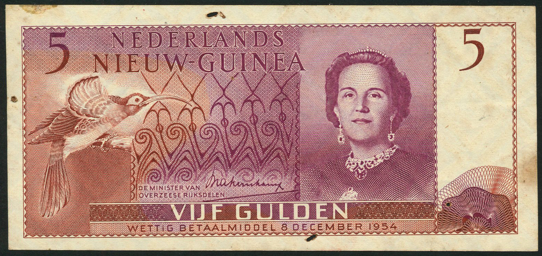 Netherlands Nieuw-Guinea, 5 gulden, 8 December 1954, serial number HK 006958, violet, red and brown, Queen Juliana at right, Sicklebill Bird at left