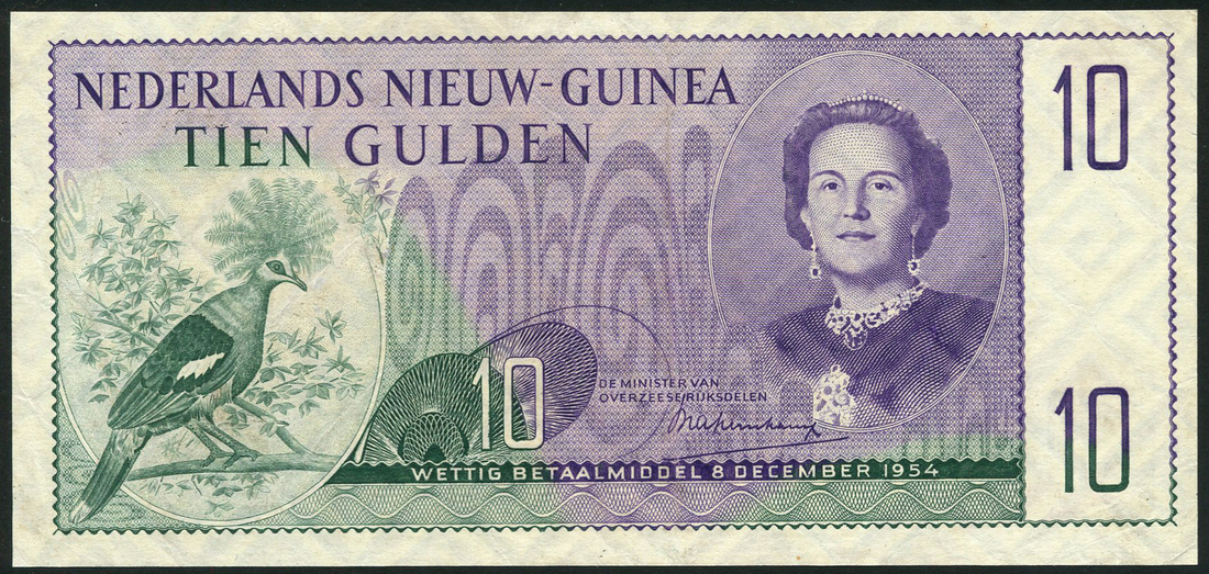 (x) Netherlands New Guinea, 10 gulden, 8 December 1954, serial number KG 062585, violet and green, Queen Juliana, Crowned Pidgeon at left, Kernkamp signature, reverse brown and pale blue, bird of Paradise at centre