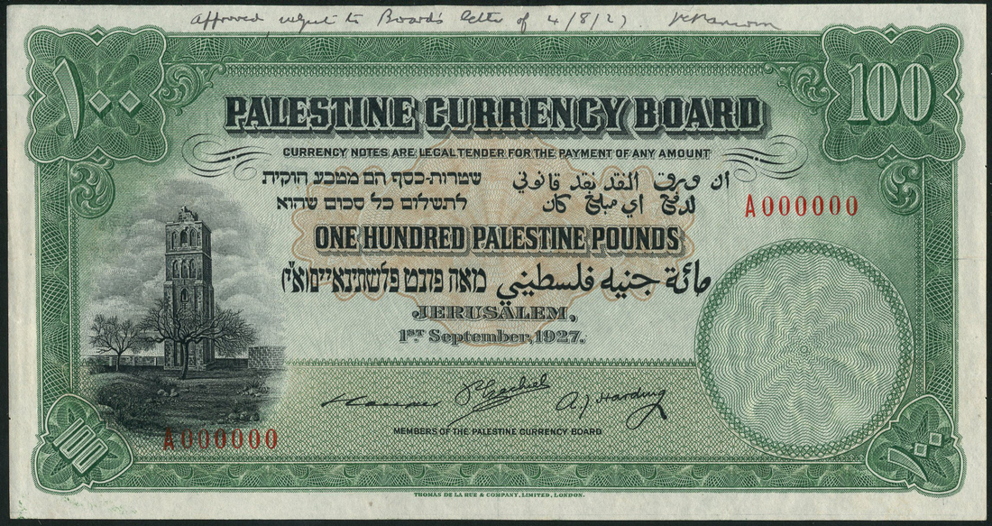 (†) Palestine Currency Board, specimen £100, 1 September 1927, serial number A000000, green, the White Tower at Ramleh at left, value at centre in pale brown guilloche, value at each corner, three printed signatures low centre of Sir Percy Ezchiel, Leslie Couper and Alfred John Harding, the members of the Palestine Currency Board, reverse purple and green, the Citadel of Jerusalem with the Tower of David (Migdal David) at centre, value at left and right and low centre