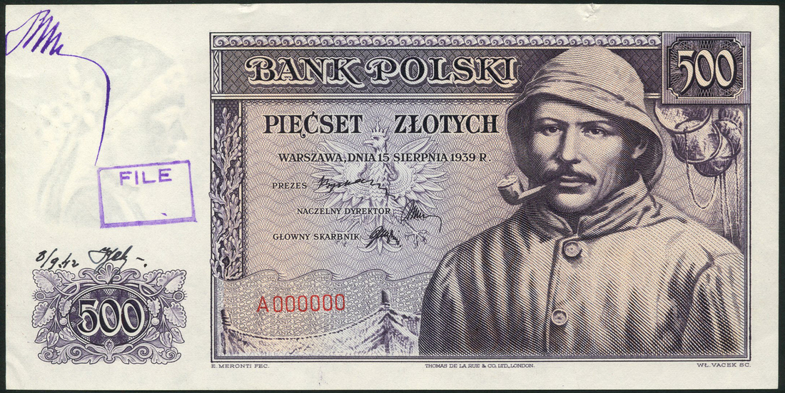 (†) Bank Polski, a specimen set from the 1939 first issue, 10 zlotych, red, 20 zlotych, blue, 50 zlotych, 100 zlotych, brown and 500 zlotych, purple, all with zero serial numbers, the 10 and 20 zlotych perforated CANCELLED, a colour trial 10 zlotych, serial number A000000, green,