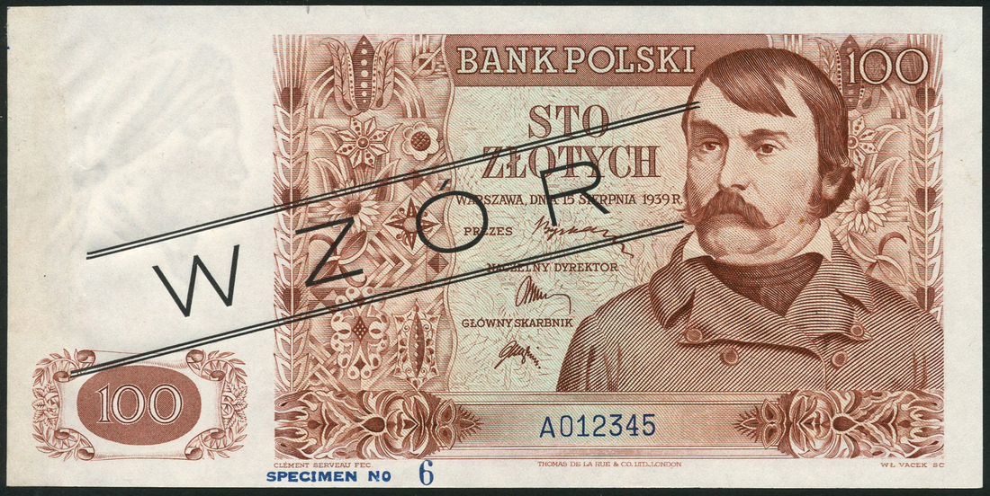 Bank Polski, specimen 100 zlotych, 15 August 1939, black serial number A 012345, brown and white, man with moustache at right, reverse brown, hillside town and river left centre