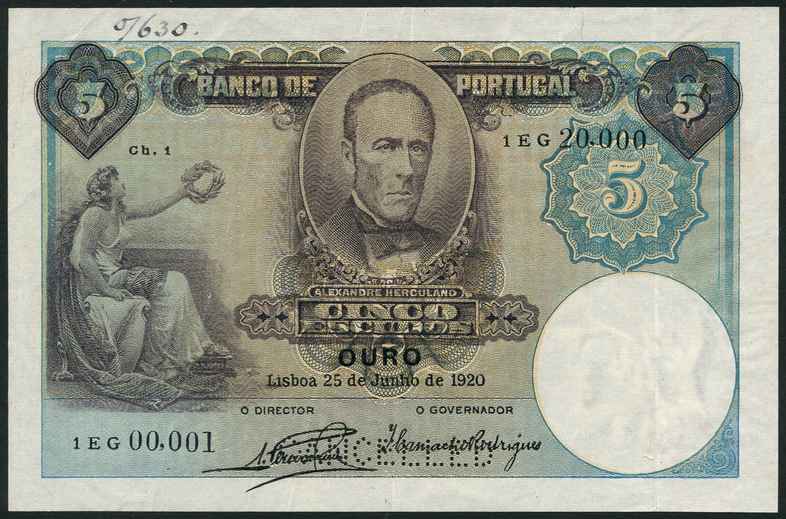 (x) Banco de Portugal, specimen 5 escudos, 1920, serial range 1EG 00,001 - 1EG 20,000, brown and blue, portrait Alexandre Herculano in circular frame top centre, woman with outstretched arm holding headdress at left, value in elaborate panels top left, top and centre right and at centre, reverse, brown and light green and yellow, castle at centre