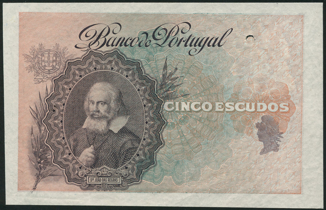 Banco de Portugal, specimen 5 escudos, ca 1920, violet, brown and green, das Regras at left, reverse, Monastery of Batalha
