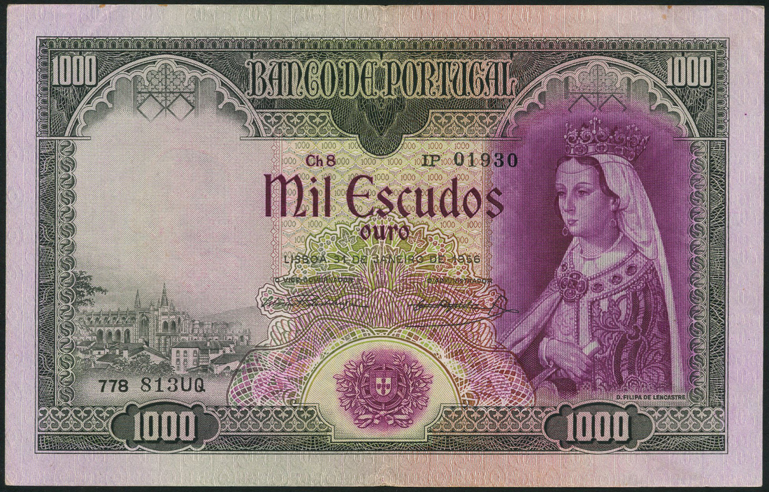(x) Banco de Portugal, 50 escudos, 1933, violet, also 50 escudos, 1947, purple and 100 escudos, 1947, green, Nunes at right, also 500 escudos, 1968, D'Almeida at right and 1000 escudos, 1956, purple and green, D.Felipe de Lencastre at right