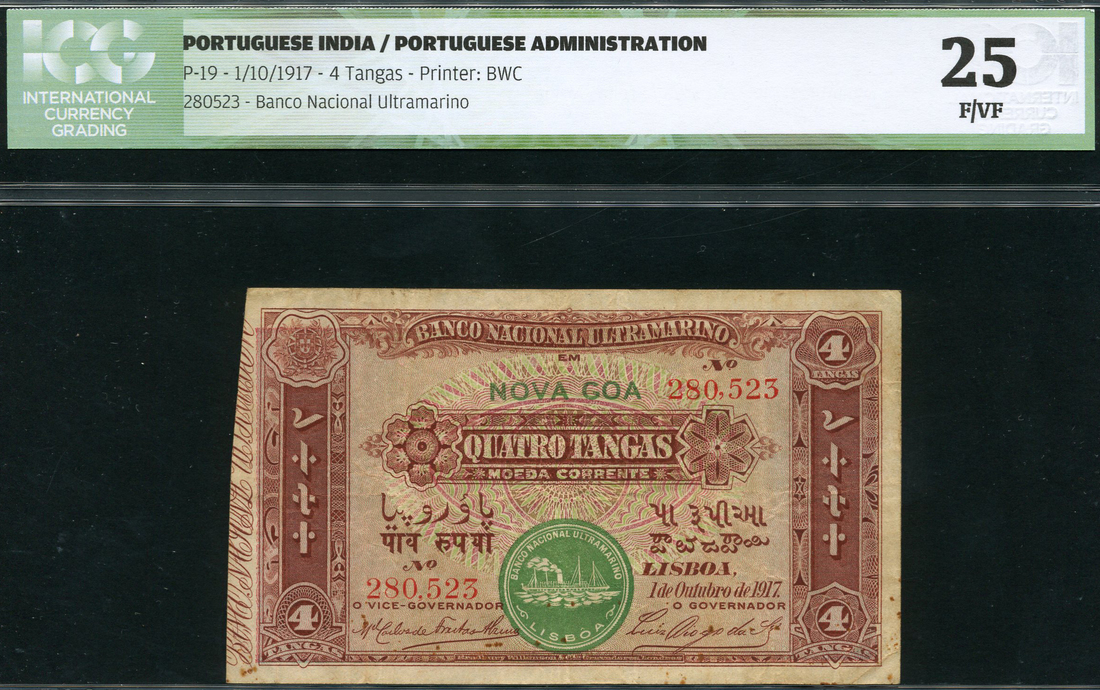 Banco Nacional Ultramarino, Nova Goa, 4 tangas, 1 October 1917, serial number 280,523, maroon on multicolour underprint, green steamship seal at low centre, value at corners, reverse with allegorical maiden and ships