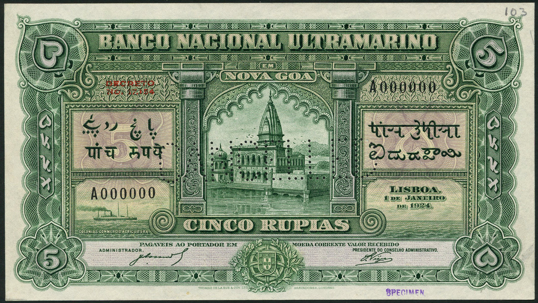 (†) Banco Nacional Ultramarino, Portuguese India, specimen 5 rupias, 1 January 1924, serial number A000000, green and lilac, temple at centre, steamship low left, arms low centre, value at left and right and at each corner, signatures of Ulrich and Monteiro de Mendonca, reverse, green, tiger at centre flanked by values, perforated CANCELLED