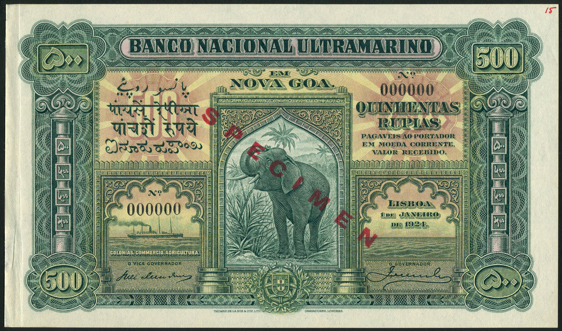 Banco Nacional Ultramarino, Portuguese India, a specimen 500 rupias, 1 January 1924, black zero serial numbers, green and multicoloured, elephant at centre, steamship low left, column at left and right, arms low centre, signatures of Ulrich and Monteiro de Mendonca, reverse green, galleon at centre, value at left and right, red SPECIMEN overprint,