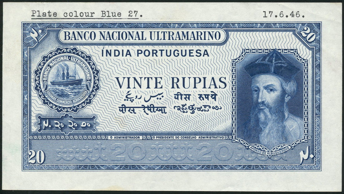 Banco Nacional Ultramarino, Portuguese India, obverse and reverse die proof for 20 rupias, 1946, blue print, Albuquerque at right, steamship seal at left, value at centre and each corner, reverse blue, woman watching ships at left, arms at right