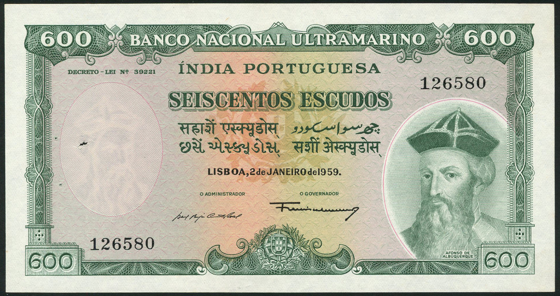 (x) Banco Nacional Ultramarino, Portuguese India, 300 Escudos, 2 January 1959, serial number 045485, L.P. Coutinho and F.J.V. Machado signature variety, violet, 600 Escudos, 2 January 1959, serial number 126580, green, A.B.Corte Real and F.J.Vieria Machado signature variety, green on multicolour