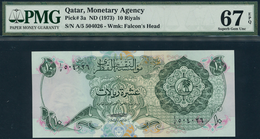 Qatar Monetary Agency, 10 riyals, ND (1973), serial number A/5 504026, green on multicolour, coat of arms at right, reverse green, Qatar Monetary headquarters building