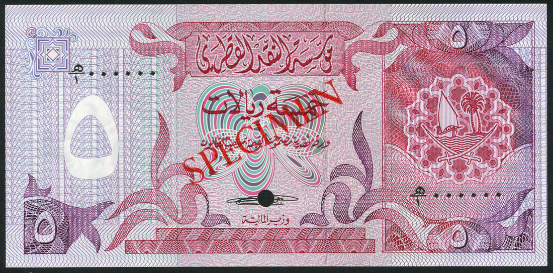 Qatar Monetary Agency, specimen 5 riyals, ND (1981), zero serial numbers, purple and multicoloured, arms at right, value at left, signature of Abdulaziz al-Thani, reverse sheep