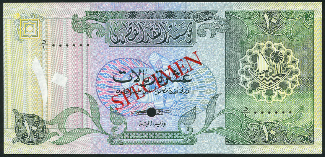 Qatar Monetary Agency, specimen 10 riyals, ND (1981), zero serial numbers, green and multicoloured, arms at right, value at left, signature of Abdulaziz al-Thani, reverse the National Museum building