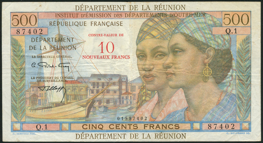 (x) Institut d'Emission des Departments d'Outre-Mer, Reunion, 500 francs, ND (1964), serial number Q.1 87402, multicolour, two ladies at right, sailboat in harbour at left, reverse, farmers and oxen with carts, pineapples and bananas at left and right