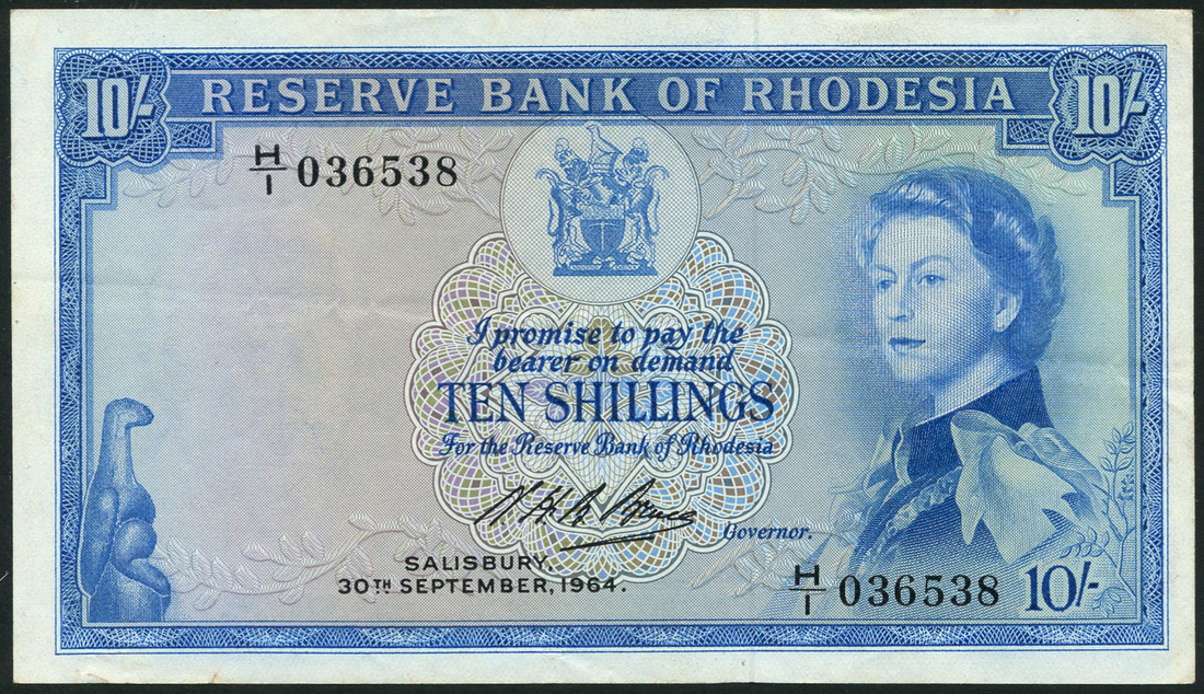 Reserve Bank of Rhodesia, 10 shillings, 30 September 1964, serial number H/1 036538, blue, portrait Queen Elizabeth II at right, bank title top centre with arms below, carving low left, reverse, tobacco field, ornate border