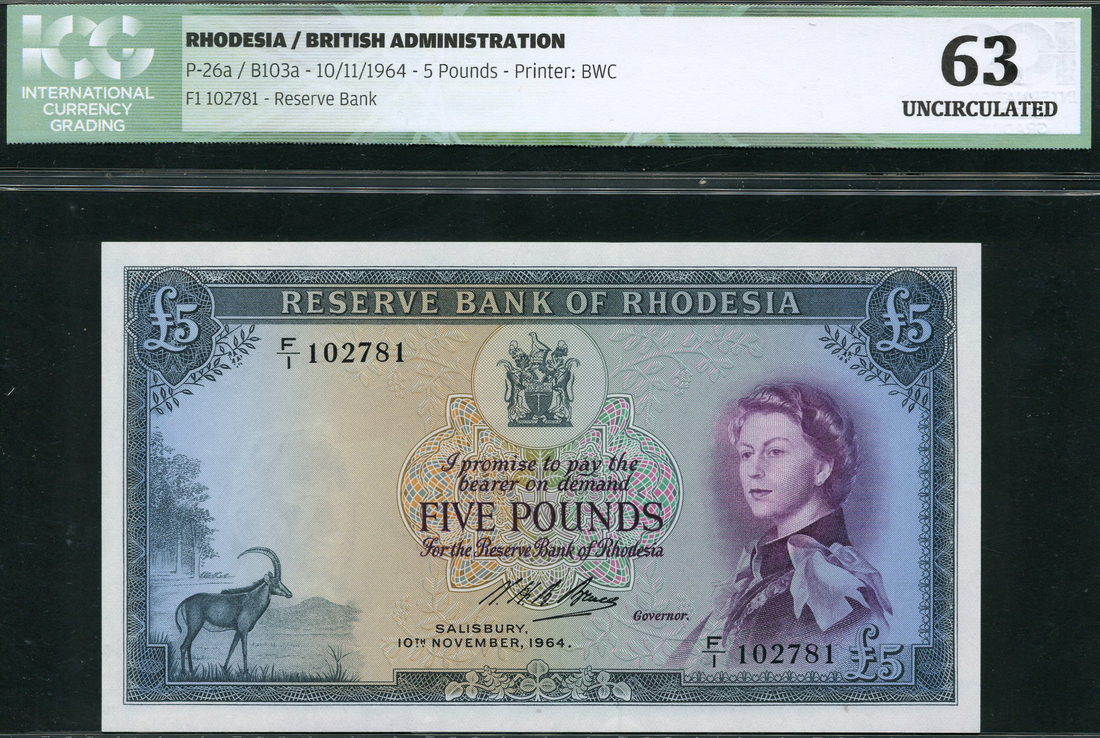 Reserve Bank of Rhodesia, 5 pounds, 10 November 1964, serial number F/1 102781, purple and multicoloured, Elizabeth II at right, Sable antelope low left, Bruce signature, reverse purple, Great Zimbabwe ruins