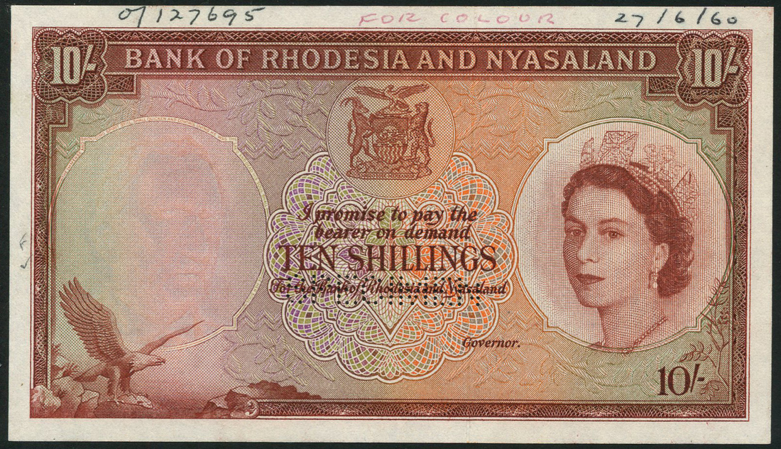 (†) Bank of Rhodesia and Nyasaland, specimen proof 10 Shillings, ND (1960), no serial numbers, no signatures; also printer's archival specimen 10 Shillings (2), 3 April 1956, serial number run W/1 000001 to W/1 1000000, signature Grafftey-Smith; 13 January 1961, serial number run W/26 000001 to W/26 1000000, signature Richards, all red-brown and multicoloured, portrait of Queen Elizabeth II at right, reverse river scene, perforated SPECIMEN