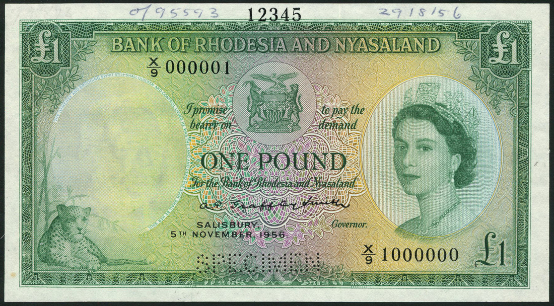 (†) Bank of Rhodesia and Nyasaland, printer's archival specimen £1, 5 November 1956, serial number run X/9 000001 to X/9 1000000, signature Grafftey-Smith; green and multicoloured, portrait of Queen Elizabeth II at right, reverse Zimbabwe ruins, perforated SPECIMEN