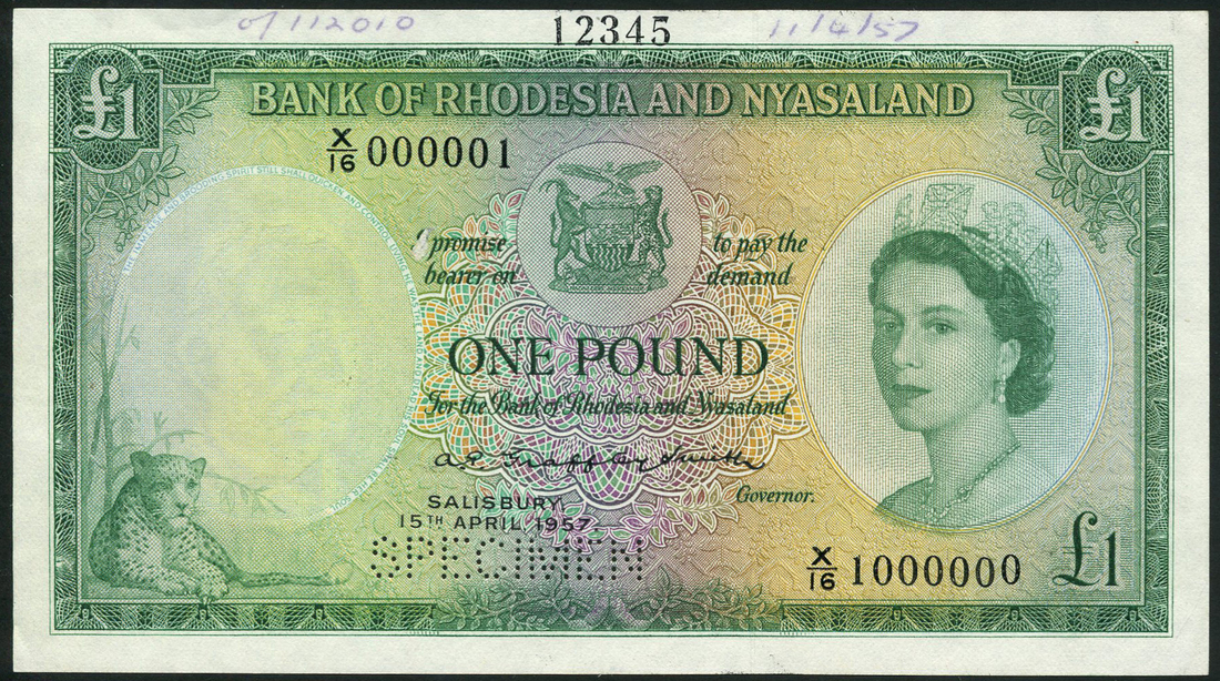 (†) Bank of Rhodesia and Nyasaland, printer's archival specimen £1 (2), 15 April 1957, serial number run X/16 000001 to X/16 1000000, 26 March 1959, serial number run X/28 000001 to X/28 1000000, both signature Grafftey-Smith; green and multicoloured, portrait of Queen Elizabeth II at right, reverse Zimbabwe ruins, perforated SPECIMEN