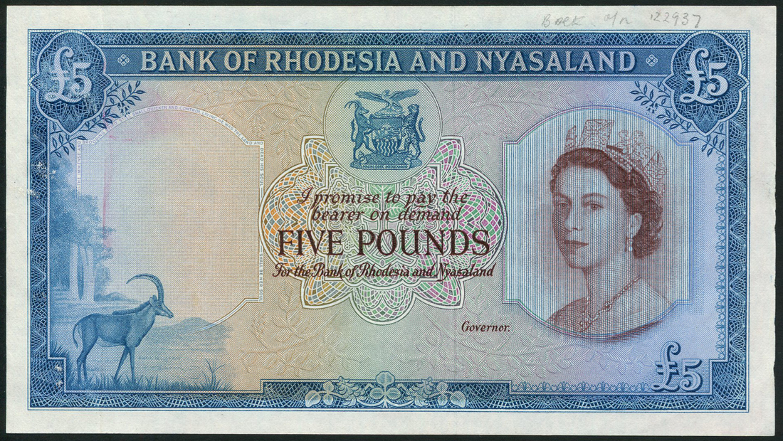 (†) Bank of Rhodesia and Nyasaland, specimen progressive proof £5, ND (1961), no serial numbers, no signatures, obverse underprint only, complete reverse; specimen proof £5 (2), ND (1959-60), no serial numbers, no signatures, the second and third portrait of Queen Elizabeth II at right, all reverse Victoria Falls, two copies perforated SPECIMEN