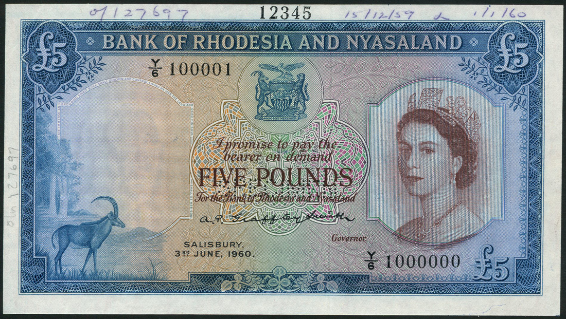 (†) Bank of Rhodesia and Nyasaland, specimen progressive proof £5, ND (1961), no serial numbers, no signatures, obverse without portrait of Queen and brown text, complete reverse; specimen proof £5, ND (1961), no serial numbers, no signatures; printer's archival specimen £5, 3 June 1960, serial number run Y/6 100001 to Y/6 1000000, signature Grafftey-Smith, both portrait of Queen Elizabeth II at right, all reverse Victoria Falls, perforated SPECIMEN