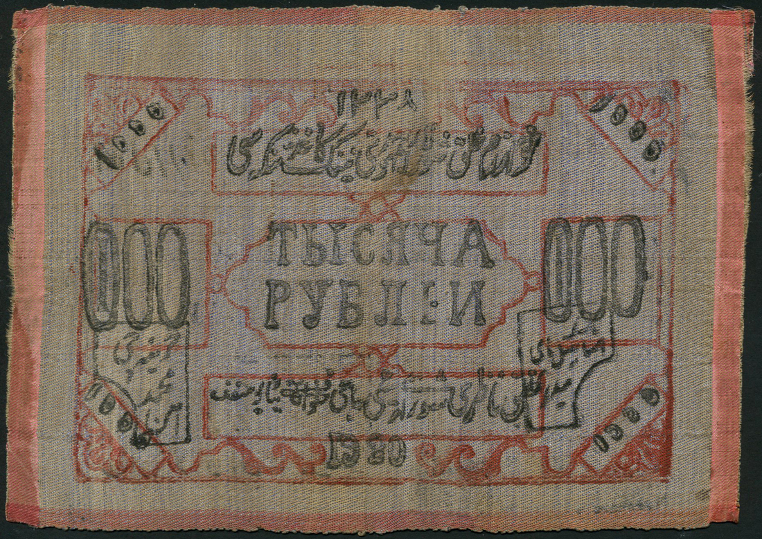 (x) Russia, Khorezmian Peoples Soviet Republic, 1000 rubles, 1920, printed on silk, black on red and blue, value at corners