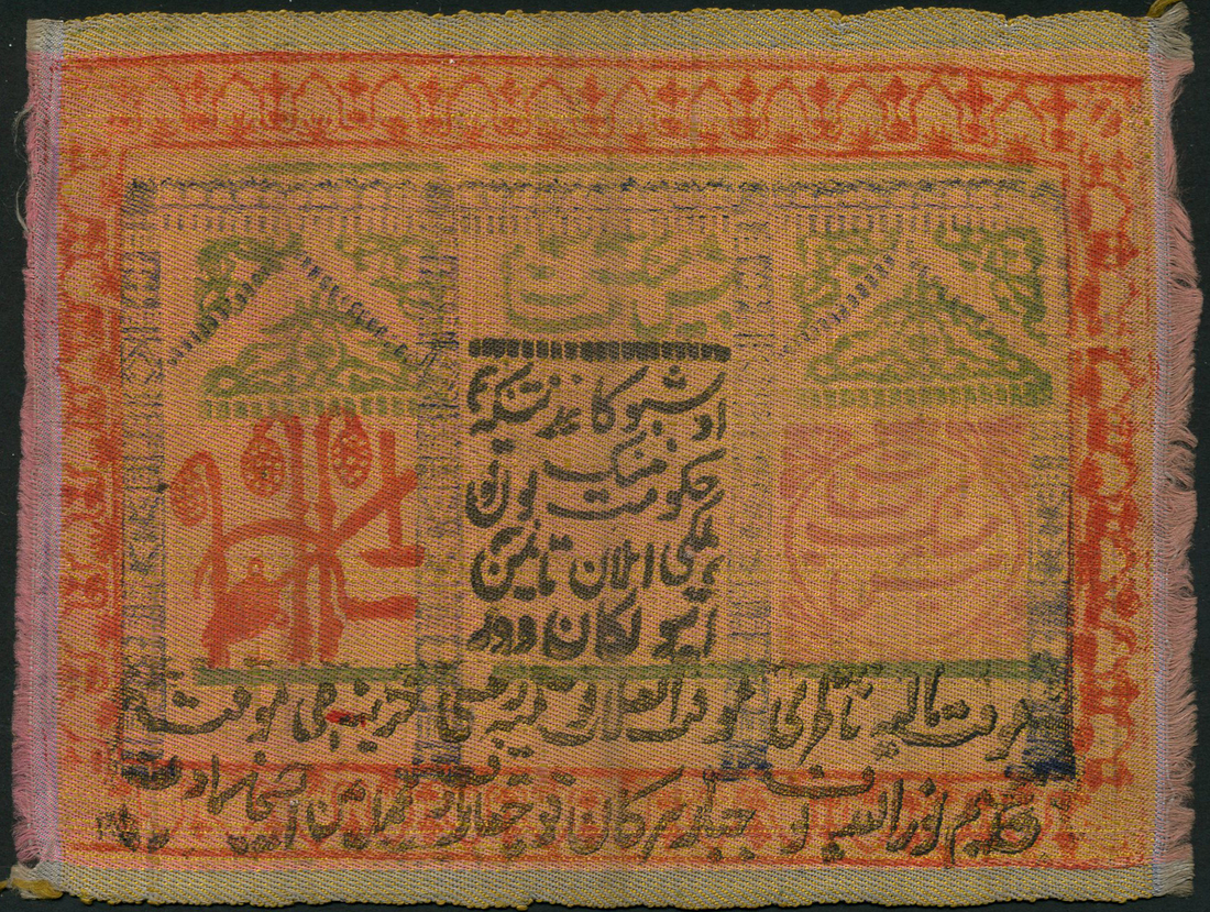(x) Russia, Khorezmian Peoples Soviet Republic, 5000 rubles, 1921, printed on silk, red, dark blue, green and yellow, hammer and sickle with plants at left
