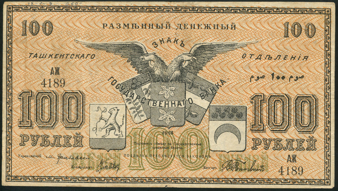 (x) Russia, Turkestan District, a group of exchange currency notes issue, 1918, comprising 1, 5, 10, 25, 50, 50 and 100 (2) rubles, various colours, several with female bust at top centre, others with double headed eagle