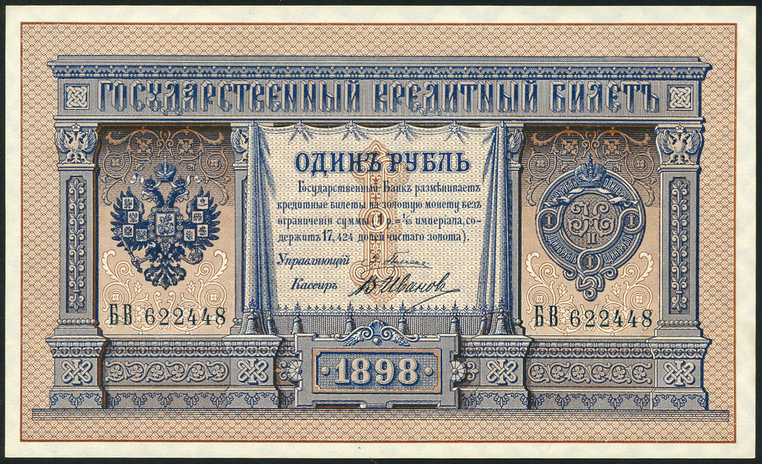 Russia, State Credit Note, 1 ruble (2), 1898 (1898-1903), serial numbers 622448-49, blue on brown underprint, Russian Eagle at left, monogram at right, reverse brown, Russian Eagle at centre, Pleske signature