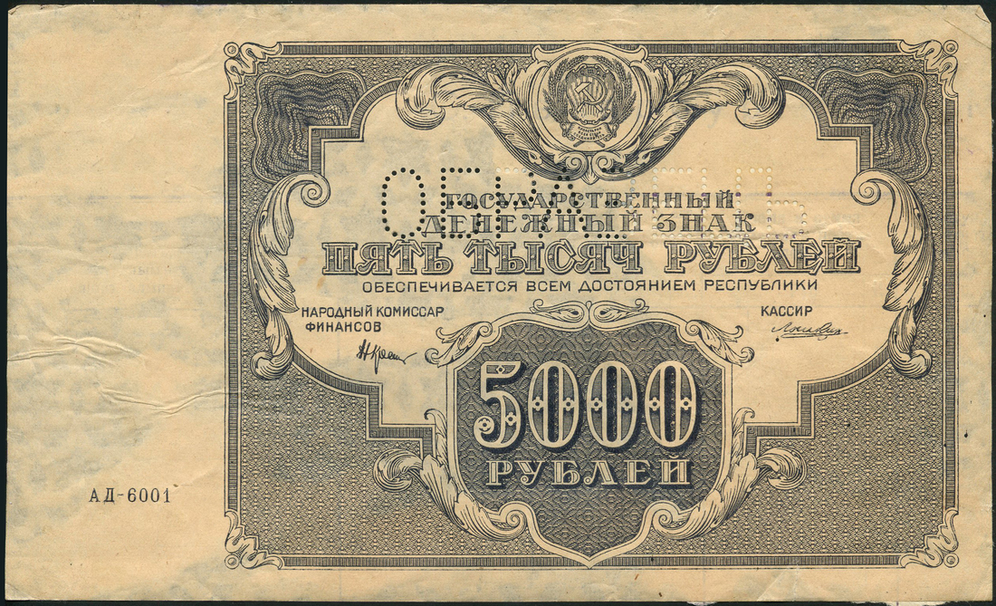 Russia, State Currency Notes, obverse and reverse proof for 5000 rubles, 1922, serial number A-6001, obverse purple, without underprint, arms at top centre, value at low centre, reverse multicoloured, value at top left and right, perforated SAMPLE/SPECIMEN