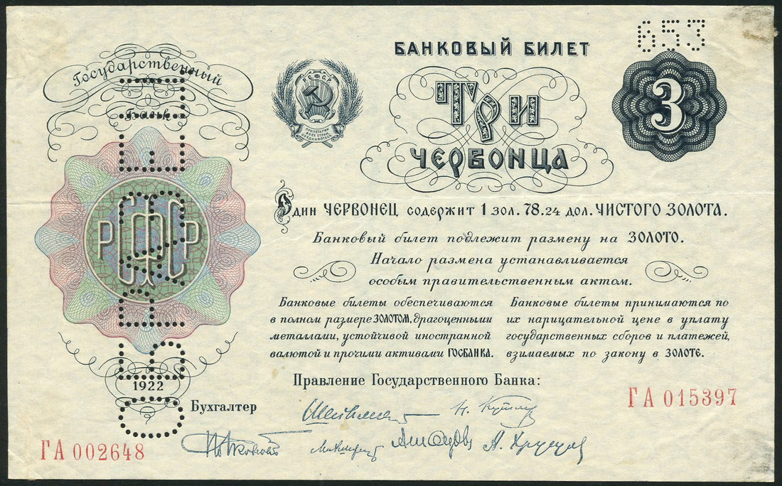 Russia, State Bank Notes, specimen 3 chervonetsa, 1922, serial number TA 002648, dark blue on red, green and purple underprint, arms at top centre, value at top right, coloured guilloche at left, perforated SAMPLE/SPECIMEN in Cyrillic