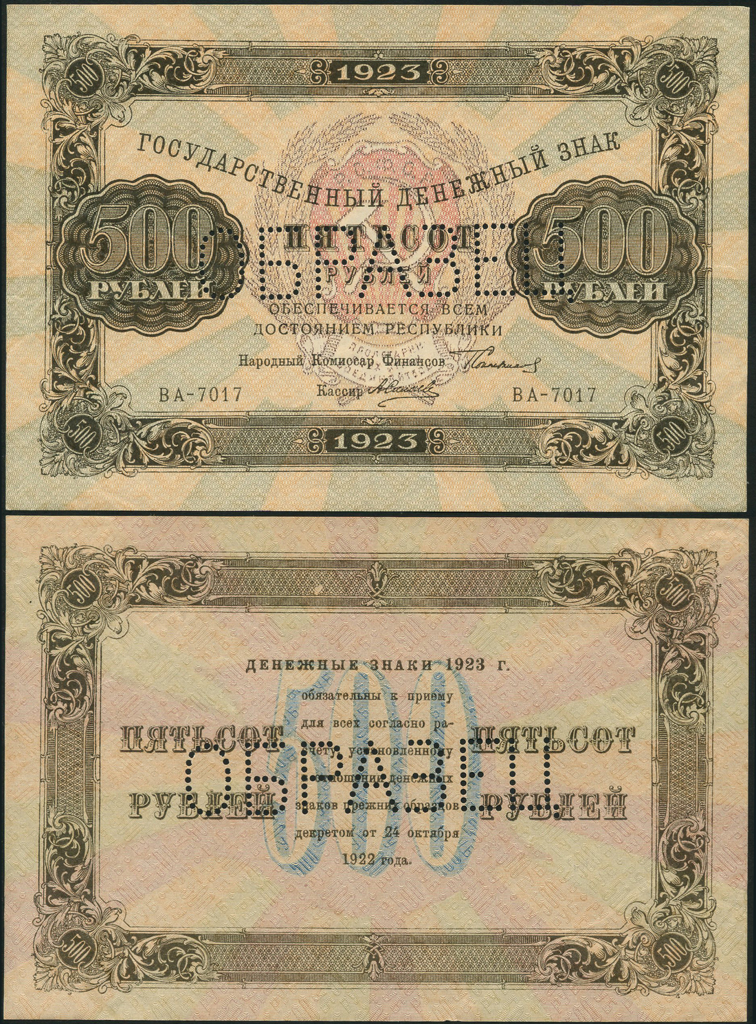 Russia, State Currency Notes, obverse and reverse uniface specimens for 500 rubles, 1923 second issue, brown on multicolour underprint, value at left and right and at each corner, arms in underprint at centre, reverse, value at each corner and in underprint at centre, perforated SAMPLE/SPECIMEN in Cyrillic