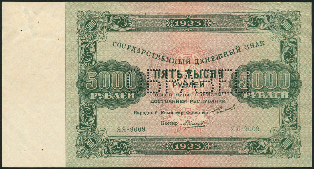 Russia, State Currency Notes, obverse and reverse uniface specimens for 5000 rubles, 1923 second issue, green on multicolour underprint, value at left and right and at each corner, arms in underprint at centre, reverse, value at left, right and at each corner and in underprint at centre, perforated SAMPLE/SPECIMEN in Cyrillic