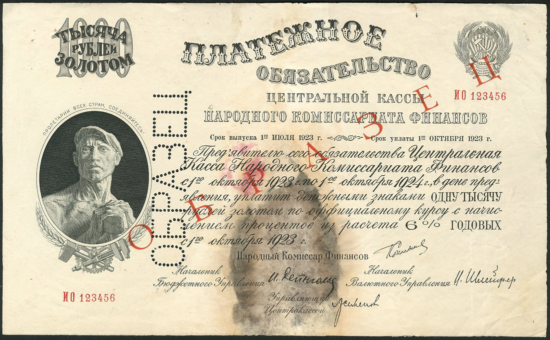 Russia, N.K.F. Payment Obligations of the R.S.F.S.R., specimen 1000 gold rubles, 1924, serial number NO 123456, black and white, man with cap and sledgehammer at left, arms at top right, value at top left, perforated and overprinted SAMPLE/SPECIMEN in Cyrillic