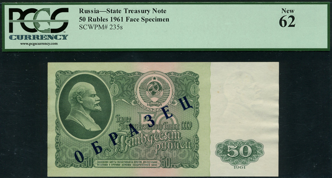 Russia, State Treasury Note, uniface obverse and reverse proofs/specimens for 50 rubles, 1961, red zero serial numbers, dark green on multicolour underprint, Lenin at left, arms at top centre, value at low right, reverse Kremlin at centre