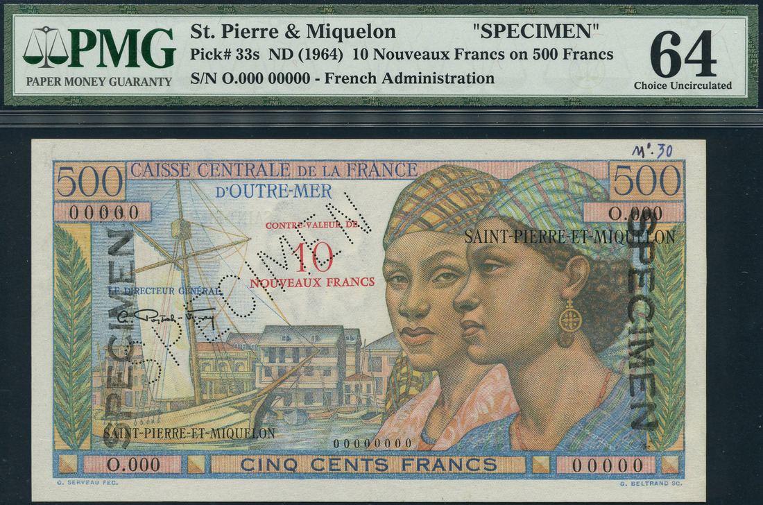 (x) Saint Pierre and Miquelon, specimen 10 NOUVEAUX FRANCS on 500 francs, ND (1964), zero serial numbers, multicoloured, women at right, quayside left centre, Postel-Vinay signature