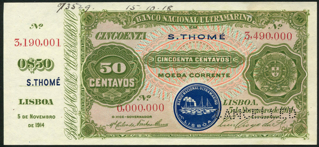 (†) Banco Nacional Ultramarino, St Thomas and Prince, printer's archival specimen 10 Centavos, 5 November 1914, serial number run 2,800,001 to 3,200,000, purple and multicoloured; printer's archival specimen 20 Centavos, 5 November 1914, serial number run 4,070,001 to 4,120,000, blue and multicoloured; and printer's archival specimen 50 Centavos, serial number run 3,190,000 to 3,490,000, green and multicoloured, all arms at right, value at left, reverse, woman, anchor and ships, perforated CANCELLED