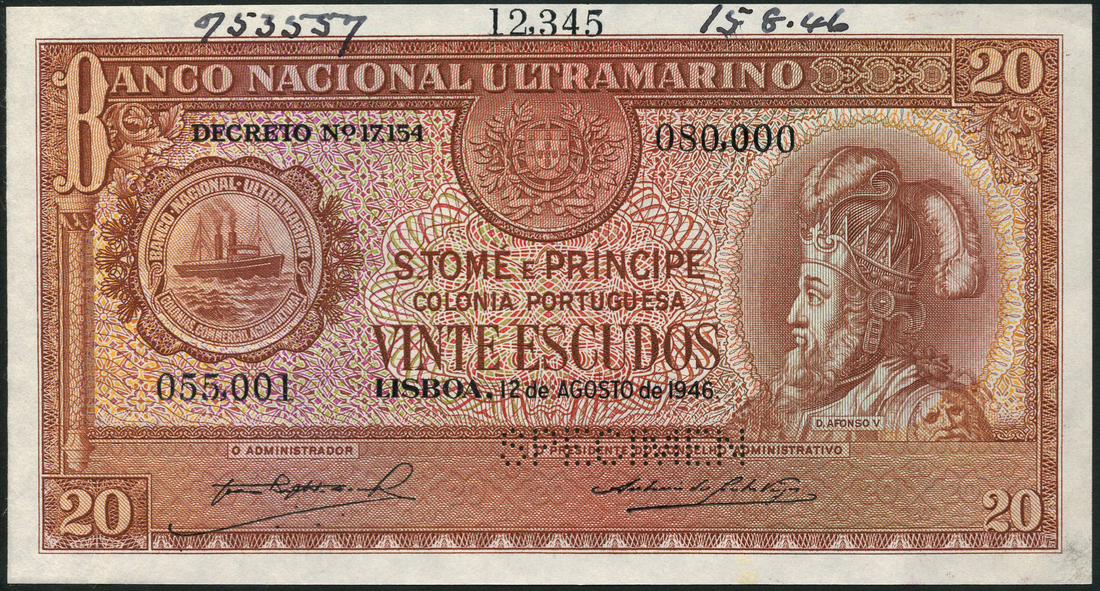(†) Banco Nacional Ultramarino, St Thomas and Prince, printer's archival specimen 20 Escudos, 12 August 1946, serial number runs 000,001 to 030,000, signature Machado; 030,001 to 055,000, signature Visconde de Merceana; 055,001 to 080,000, signature Araujo; 090,001 to 095,000, signature Aguiar; 095,001 to 120,000, signature Coelho; and 120,001 to 150,000, signature Pimenta, all brown and multicoloured, portrait of D. Afonso V at right, steamship seal at left, reverse, young woman looking out at ships, perforated SPECIMEN