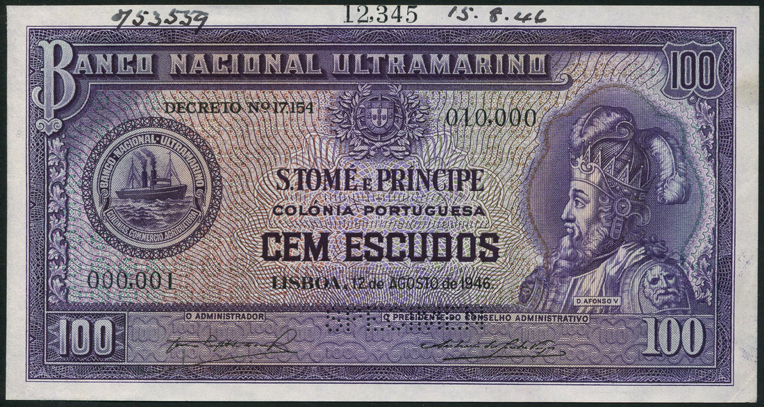 (†) Banco Nacional Ultramarino, St Thomas and Prince, printer's archival specimen 100 Escudos, 12 August 1946, serial number runs 000,001 to 010,000, signature Araujo; 010,001 to 020,000, signature Aguiar; 020,001 to 025,000, signature Coelho; 025,001 to 030,000, signature Pimenta, all purple and multicoloured, portrait of D. Afonso V at right, steamship seal at left, reverse, young woman looking out at ships, perforated SPECIMEN