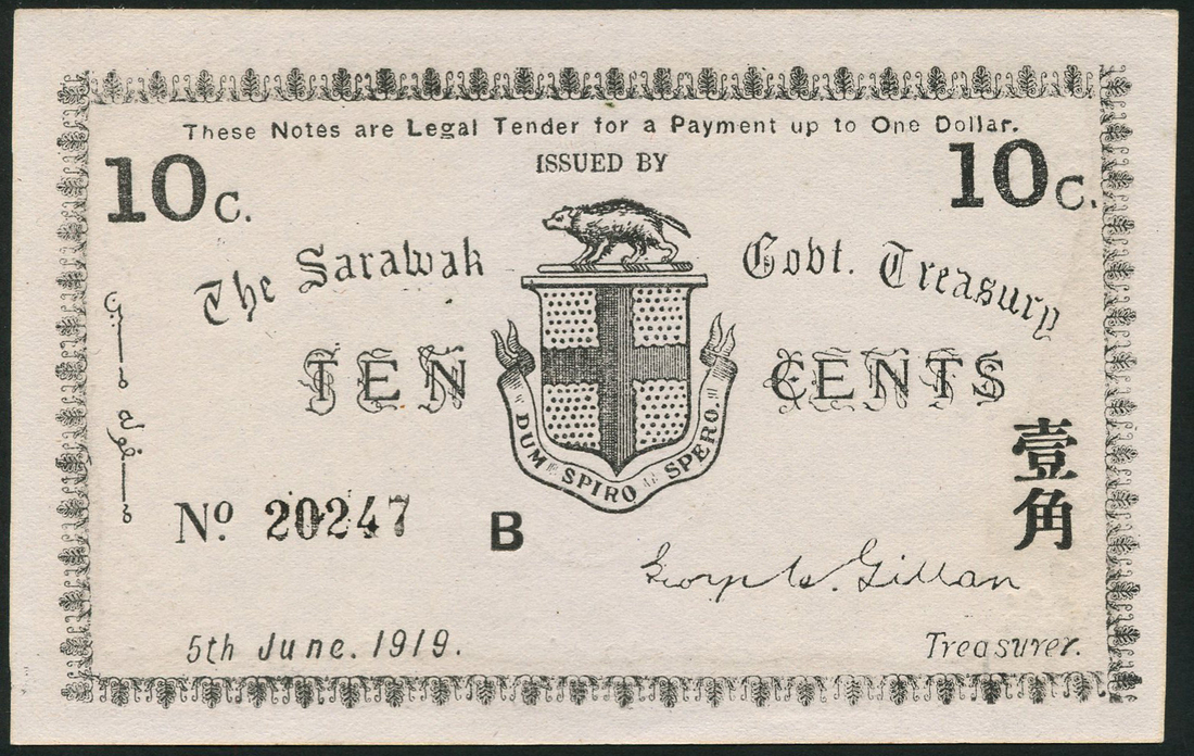 Sarawak Government Treasury, 10 cents, 5 June 1919, serial number 20247 B, black, arms with badger at centre, value at top left and right, reverse with arms at centre, flanked by values