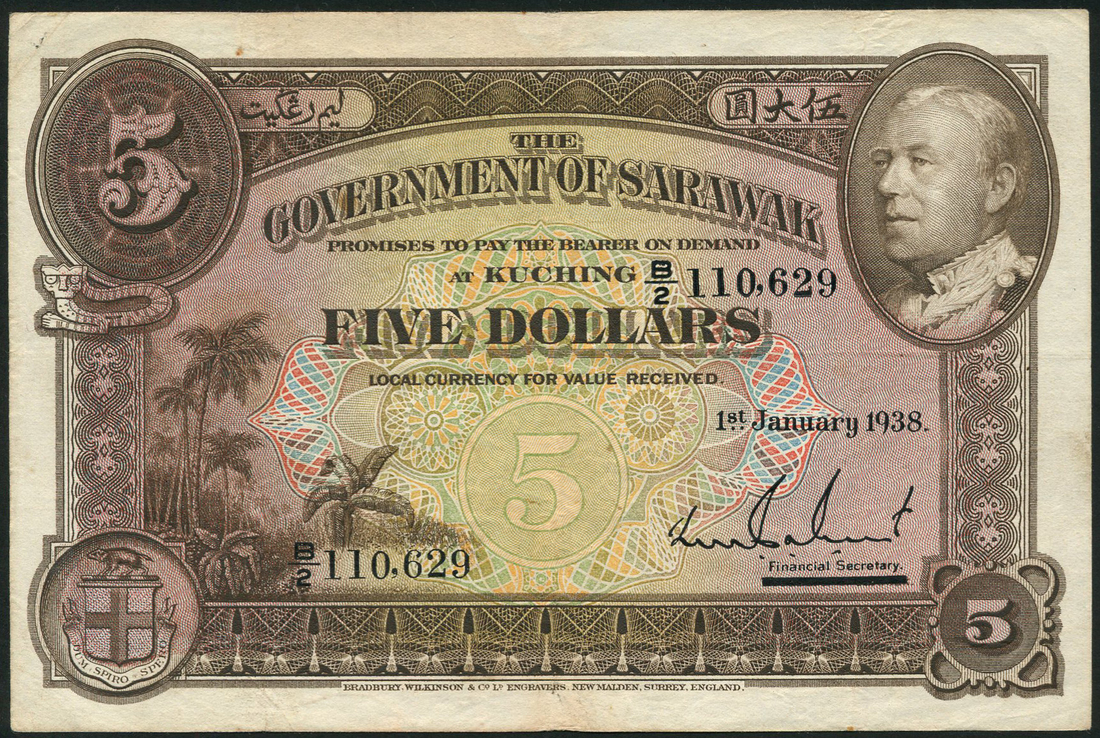 Governmment of Sarawak, $5, 1 January 1938, serial number B/2 110,629, brown on multicolour underprint, Charles Vyner Brook at right, arms at low left, value at low centre, low right, and each corner, reverse purple, value at centre