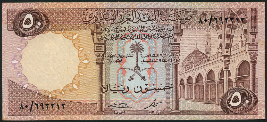 Saudi Arabian Monetary Authority, 50 riyals, ND (1976), serial number 80/692212, purple and multicolour, arms at centre flanked by columns, minaret of Al-Masjid al-Nabawi in Medina at right, reverse, avenues of palm trees
