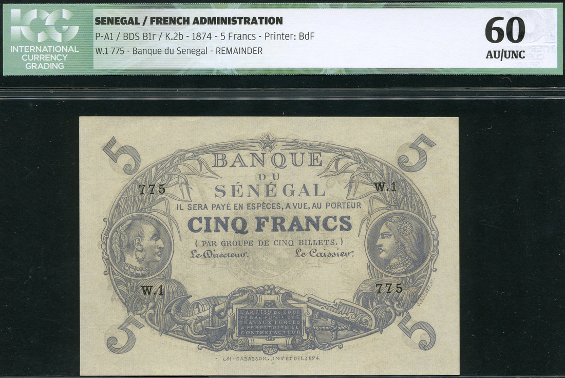 Banque de Senegal, 5 francs, 1874, serial number W1 775, blue and white, indigenous head at left and right, reverse black and white, female head at centre, stars at left and right